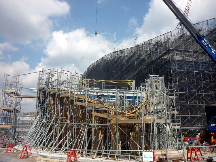 コンクリート打設足場はサポートの間に枠組足場を組立てる計画としました。