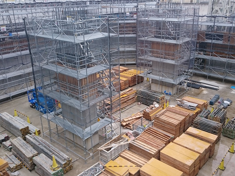 支保工にはハイパーシステムを採用し、ジャングルジムのような支保工の中、型枠工事を実施しました。